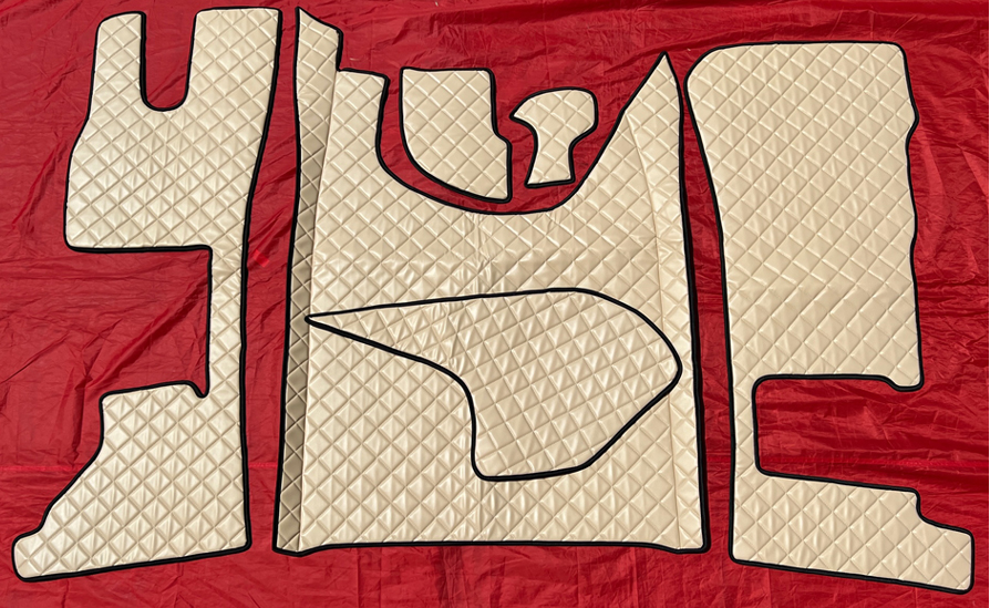 Koženka je prošitá a tvoří čtvercový vzor. Koberce na sebe navzájem navazují.